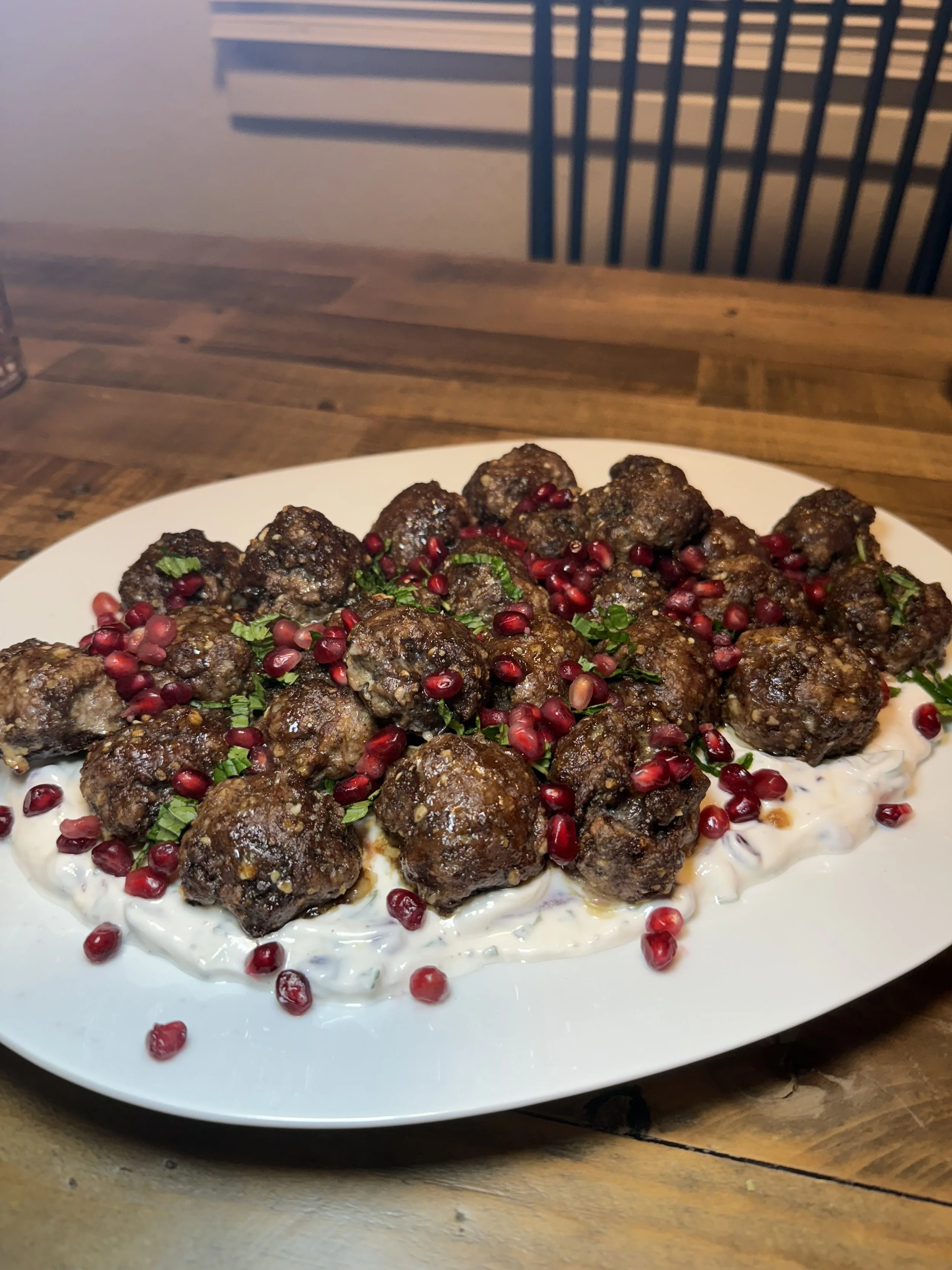 Spread a generous amount of yogurt sauce on bottom of serving plate, top with meatballs and garnish with extra pomegranate molasses and pomegranate seeds.