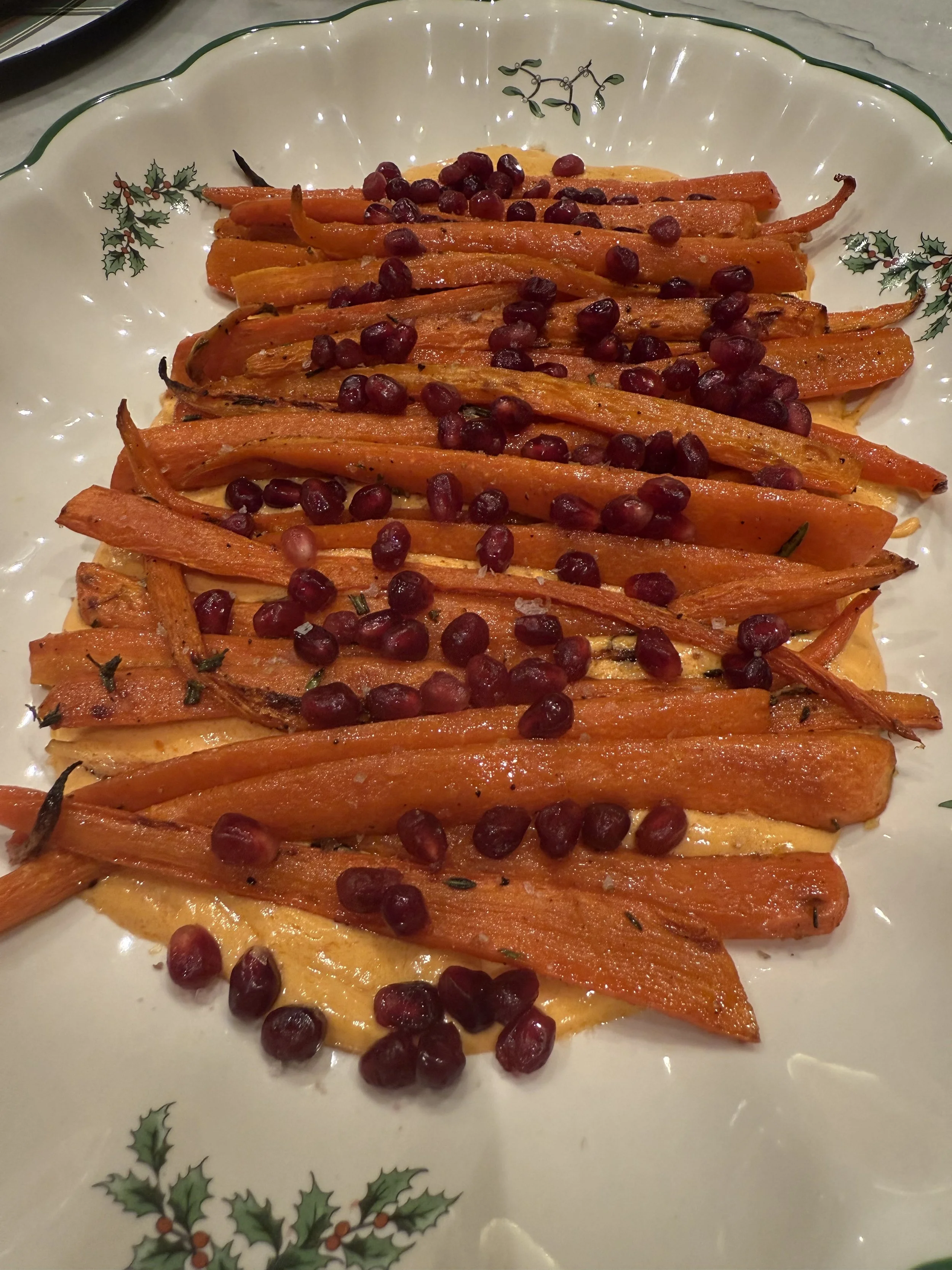 4. Spread a generous amount of harissa feta sauce on serving plate. Top with roasted carrots, then garnish with parsley or mint, pistachios and/or pomegranate seeds.